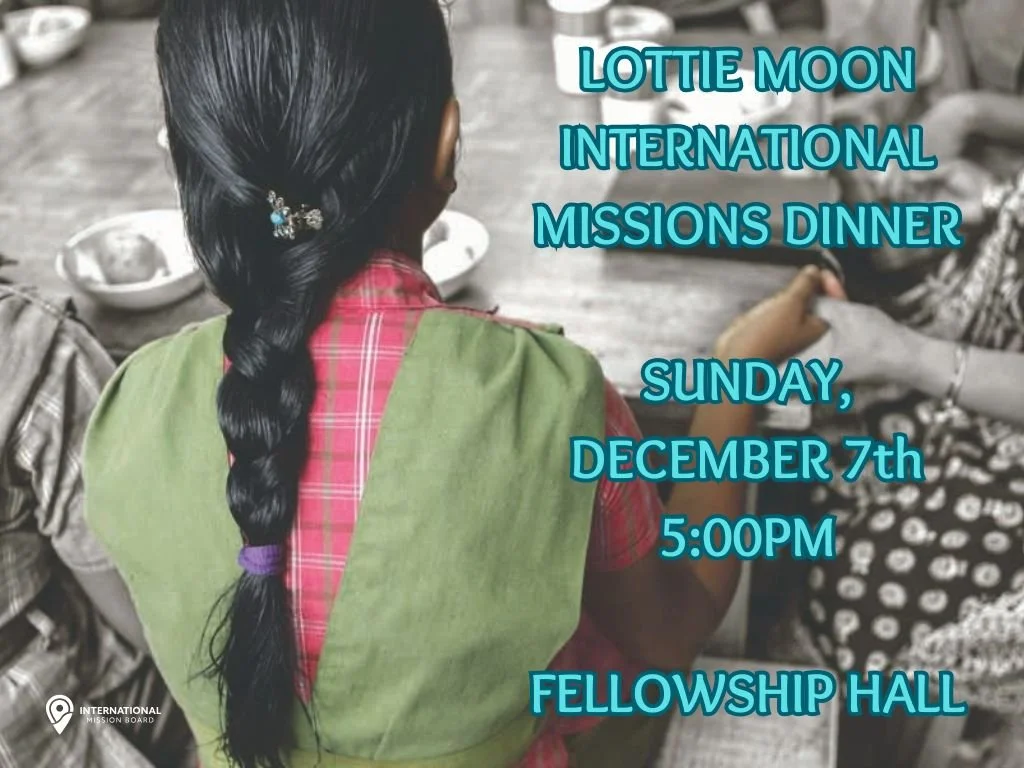 Come join us Sunday, December 7th at 5PM for our annual International Lottie Moon Missions Dinner. This is an excellent opportunity to gather as a church family, deepen our understanding of our global mission efforts, and be inspired by the sacrificial life of Lottie Moon.